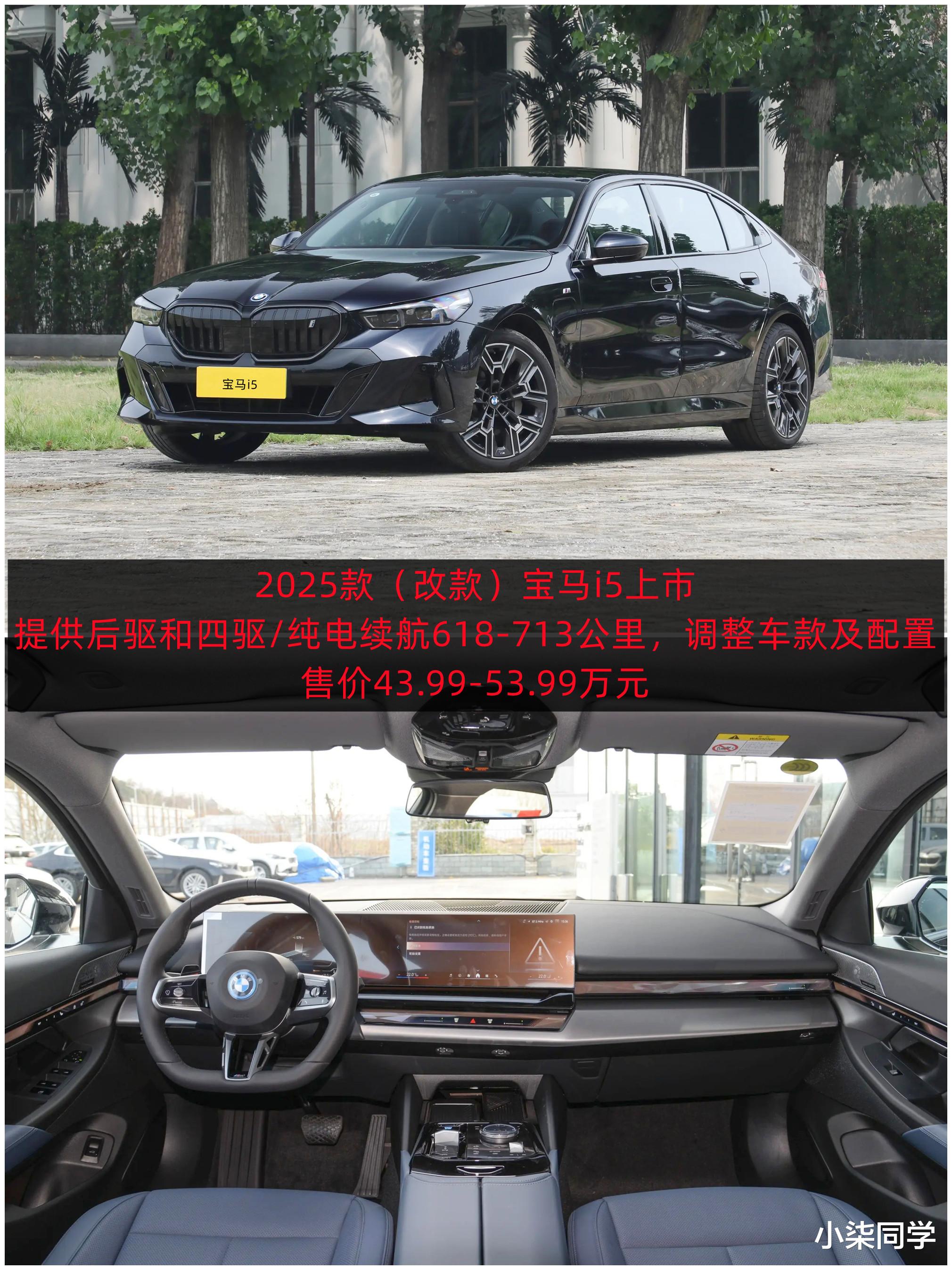 2025款(改款)宝马i5提供3款配置车型,分别为:eDrive35L M运动套装、eDrive40L M运动套装、eDrive50L M运动套装,售价分别为43.99万元、48.59万元、53.99万元。