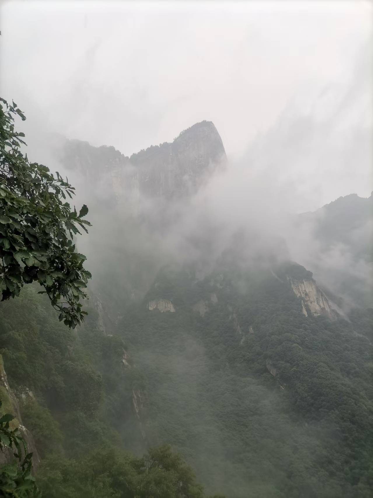 到了响水石已经下大了,云门又休息了一会儿,喇叭里喊剩下的路只有台阶而且还是向上,好绝望。到了永朝华岳出现了岔路,一条是青虎路相对好走一点,另一条到千尺㠉百尺峡等网红景点爬山路的,因为下着大雨我们选择了青虎路安全一点,这个时候已经湿透了。青虎路也不好走,走了一段路剩下的路蛇形一路向上,路上树木茂密,看不到尽头,而且碰不到人,更绝望。路上到了一个观景台,有个小姑娘卖东西,我们冒雨吃了碗泡面,小姑娘说上去还得半个小时,好不容易上到黑虎洞,在群仙观吃了个烤肠,继续走到了老君犁沟,台阶很小,从下往上看是直上直下的,这个时候雨下的更到了,台阶上仿佛瀑布一样,这时候已经不想爬了,但是没办法,硬着头皮爬了上去,到了北峰,啥也不管了,买票,走索道下山。