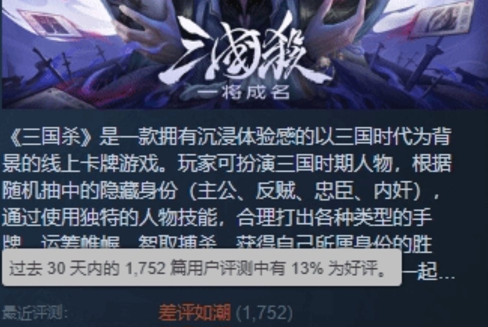 我知道这一天终究会来的,当我看到怪猎玩家的战斗力,我就知道汉室危矣。常年占据“差评如潮”榜首的《三国杀》,近期好评率意外攀升至13%,成功超越卡普空新作《怪物猎人:荒野》,无奈屈居差评榜第二名。这场看似荒诞的数值博弈,实则折射出玩家对两款游戏复杂的情感态度。