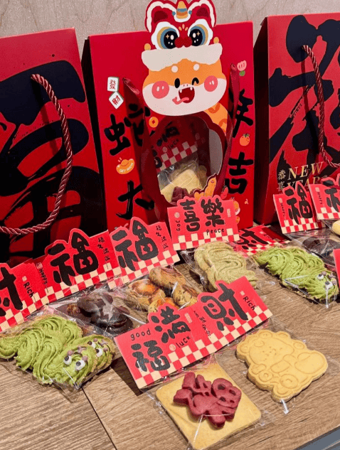礼盒里的曲奇大多是多口味组合+生肖造型的搭配,常见的有黄油原味、蔓越莓、巧克力、抹茶这四种经典口味,部分高端款还会加入焦糖榛子、咖啡等风味;每块曲奇都经过精准控温烘焙,用的是动物黄油,入口酥松不腻,不会有工业植脂末的齁甜感。曲奇造型除了常规的方形、圆形,还会有立体的小马头、元宝、福袋样式,部分糖霜款表面还会印着 “福”“吉” 的字样,细节做得很到位。大多采用独立小包装,一次一块,既能锁住新鲜度,也方便分享和随身携带。