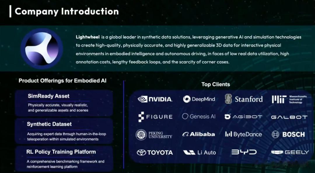 目前,光轮智能通过将生成式AI与仿真技术深度融合,为机器人在工业制造、家庭环境及农业等各种场景提供高质量的3D合成数据解决方案,有效应对数据稀缺与泛化性不足等关键挑战。公司已与全球数十家行业领先客户及机构建立深度合作,客户生态广泛覆盖国际顶尖科技公司(如英伟达、DeepMind、Figure),以及机器人领域的前沿企业(如智元机器人、银河通用机器人等),业务正从国内市场加速拓展至全球范围。