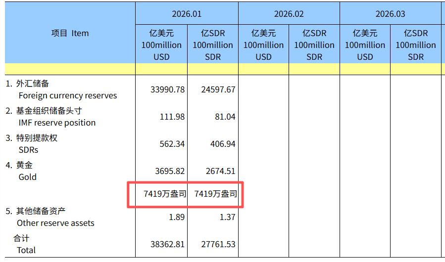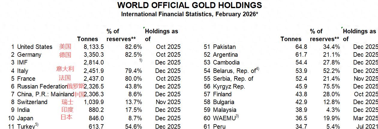 观察全球前十大黄金储备国,除俄罗斯外近年几乎无减持案例:美国、德国、意大利等长期维持高位储备;中国则自2024年11月启动新一轮增持,至2026年1月已连续15个月增持,总量从2024年10月的7280万盎司增至7419万盎司,与俄罗斯减持后的7450万盎司仅差31万盎司,预计中国将很快取代俄罗斯成为全球第五大黄金储备国。