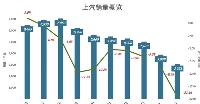 此外,根据上汽集团近20年营收来看,从2018年就开始持续缓慢的下降,虽然2024年的营收收入只到6月底,但从上面看,还没有达到2023年的一半,截然下降的背后也表示着,上汽集团正在遭受着艰难时刻。