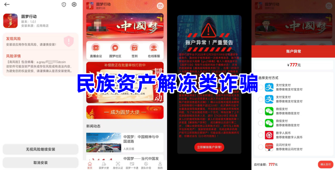 民族资产解冻类诈骗。不法分子冒充某部门的旗号,声称要为“追梦人”发放338万补偿金。