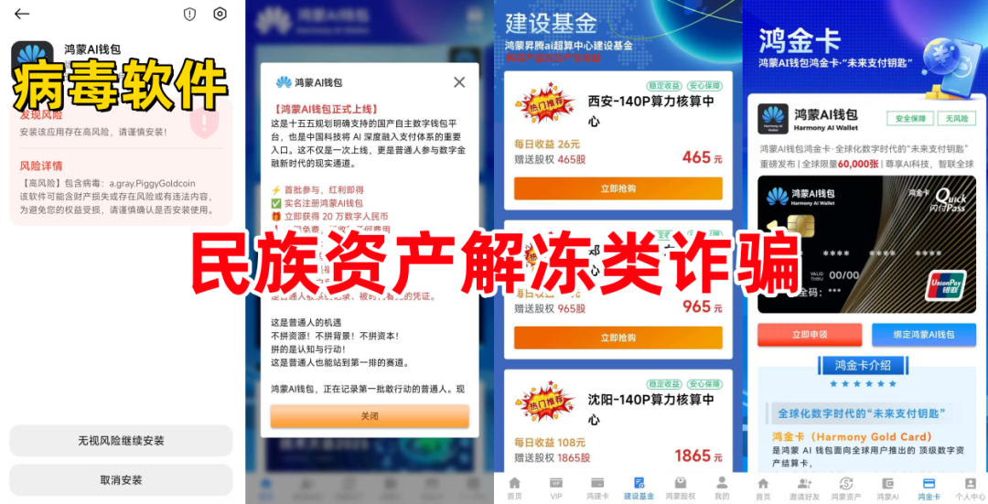 民族资产解冻类诈骗。不法分子冒充华为公司的名义,声称是自主研发的数字钱包平台,实名注册即送20万数字人民币,发展下线领取鸿蒙金卡,鸿蒙股权、推出“鸿蒙基金”高额返利理财项目。