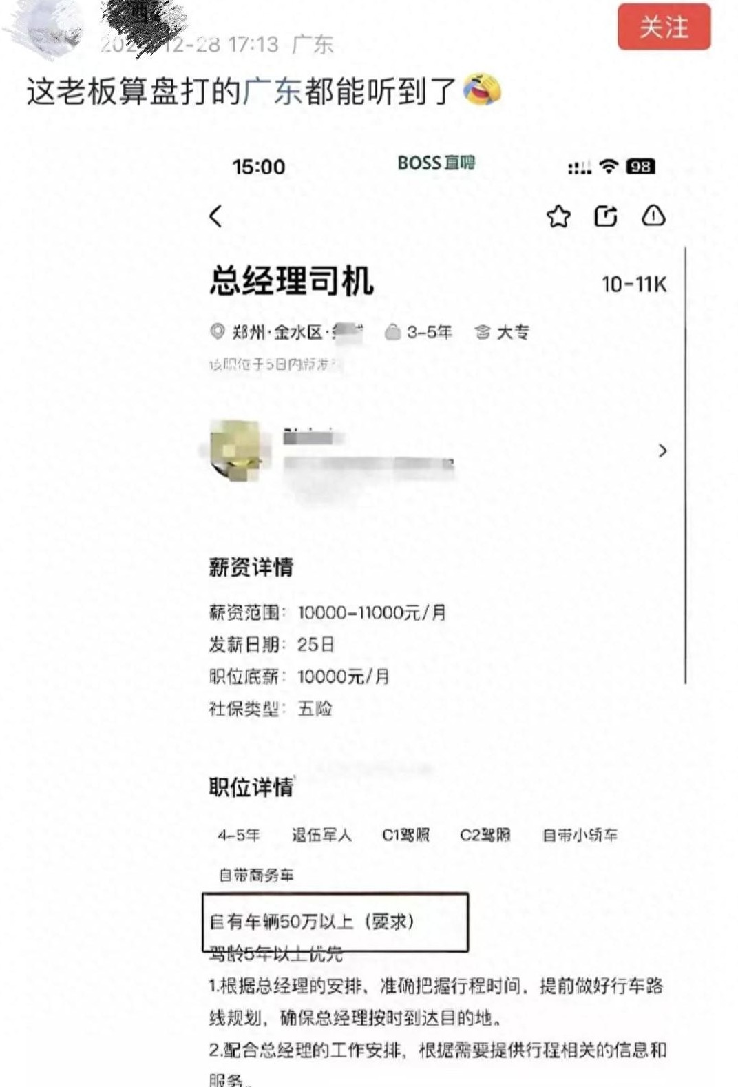 现在找工作真的不容易,三四千的工资大把人排队,上万的话那更是挤破头,要求也高,有位郑州的网友看到一企业在招聘司机,薪资高达一万以上,确切地讲是底薪一万,加上其他的大概率超过一万了,这属于高工资范畴了。但是先别急着羡慕,来看看要求,这个可不简单:1,要求自带商务车50万以上。2,要求驾龄5年以上。3,根据总经理的安排,准确把握行程时间,提前做好行车路线规划,确保总经理按时到达目的地。4,配合总经理的工作安排,根据需要提供行程相关的信息和服务。5,及时整理车内杂物,保持车内整洁干净,为总经理提供良好的乘车环境。