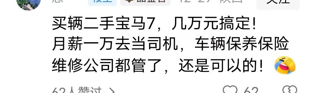 除了第一条,其他的要求想必很多司机都能达到,但没有第一条,你其他的做的再好都没用,因为自带50万以上的商务车是录取的前提。先别说这个工资的事,单就说车,50万以上的车一个月租金一万也不够啊,更何况在还带着个老司机呢。有人就说了,哪怕是十几万的车租一天也有一两百块,这要是加上司机的工资,自带十几万的车一个月也有一万了,更何况50万以上的车,写这个招聘的人在想啥呢?有知道一般这个价位的车,租的话一天大概一千左右,一个月光是租车都不止一万块,更别提还带司机了。如果按照这个招聘上写的,相当于是一天330块,就把司机和车都租到了,这个算盘打得可真响啊。当然了也有人认为这个也好办:买辆二手宝马7,几万元搞定,月薪一万去当司机,车辆保养保险维修公司都管了,还是可以的。