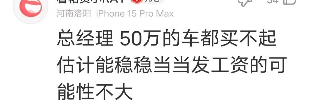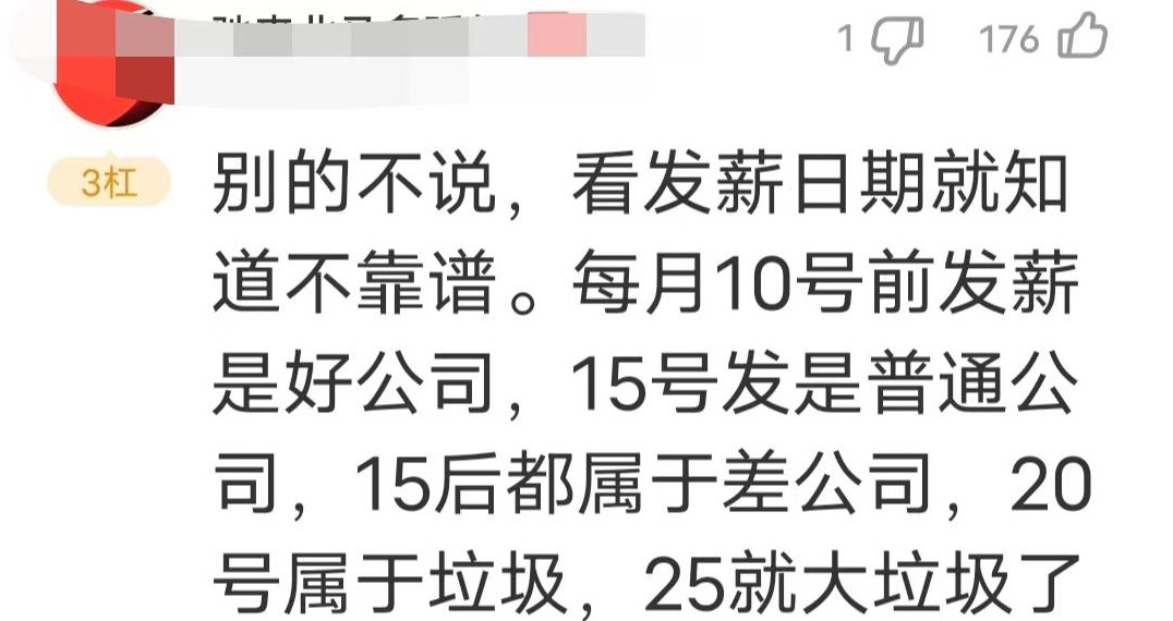 现实是,对方真的敢这么干,就是要求你自带50万以上的车辆,只给一万一个月,毕竟他们都敢这么开条件了,其他的事未必干不出来啊。只是,一个总经理想要招司机连车都没有,这家公司靠谱吗?还真是,有网友看到了一个细节,那就是25号的发薪日期,该网友认为这家公司不靠谱:别的不说,看发薪日期就知道不靠谱,每月10号前发薪是好公司,15号发是普通公司,15号以后都属于差公司,20号属于垃圾,25号就是大垃圾了。