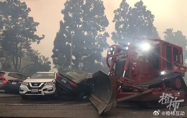 由于大量奔驰宝马保时捷特斯拉被遗弃街道上,消防部门不得不用铲车开路。77岁的艾美奖得主詹姆斯·伍兹被迫撤离时分享了家附近大火的视频并表示:“我现在正准备疏散,天上有很多飞机在降水灭火。”
