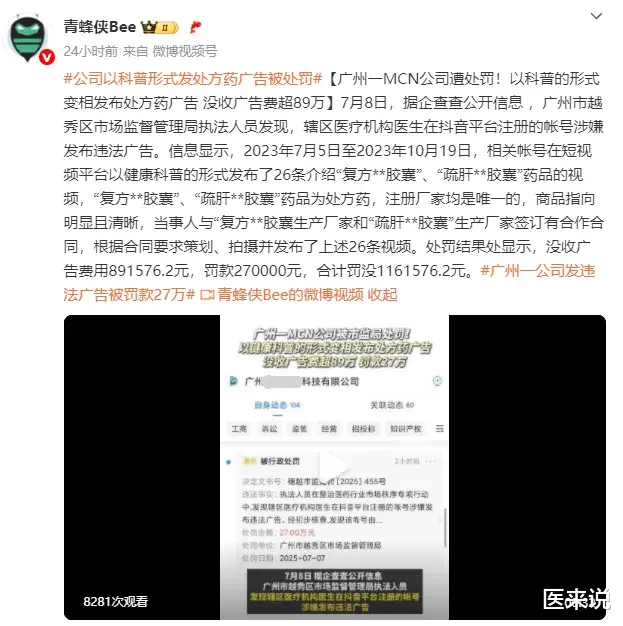 据公开信息显示,2023年7月5日至10月19日,广州市越秀区某医疗机构医生在抖音平台注册的账号,以健康科普形式发布了 26 条介绍“复方**胶囊”、“疏肝**胶囊” 两种药品的视频。值得注意的是,这两种药品均为处方药,且注册厂家唯一,商品指向明确。当事人签订了合作合同,并按照合同要求策划、拍摄并发布了这些视频。最终,相关部门作出没收广告费用891576.2元、罚款 270000元,合计罚没1161576.2元的处罚决定。