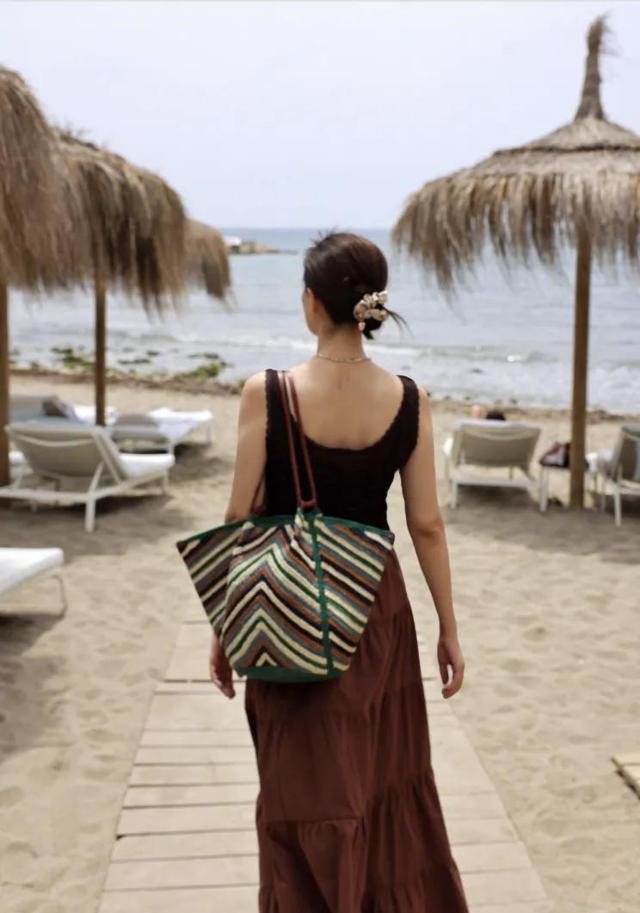 这一组黑色套装,穿起来就是另外一种感觉,黑色背心搭配酒红色的裙子,再背上一个条纹包包,整个人都是一股度假的风。