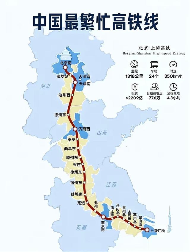 与京沪高铁的“双雄”并立提到我国最赚钱的铁路,就不得不提客运领域的“印钞机”——京沪高铁。京沪高铁虽然充满“班味儿”,但其重要性不言而喻。它连接了京津冀和长三角这两大我国经济最为发达的核心区域,沿线城市经济水平高,人口密集。