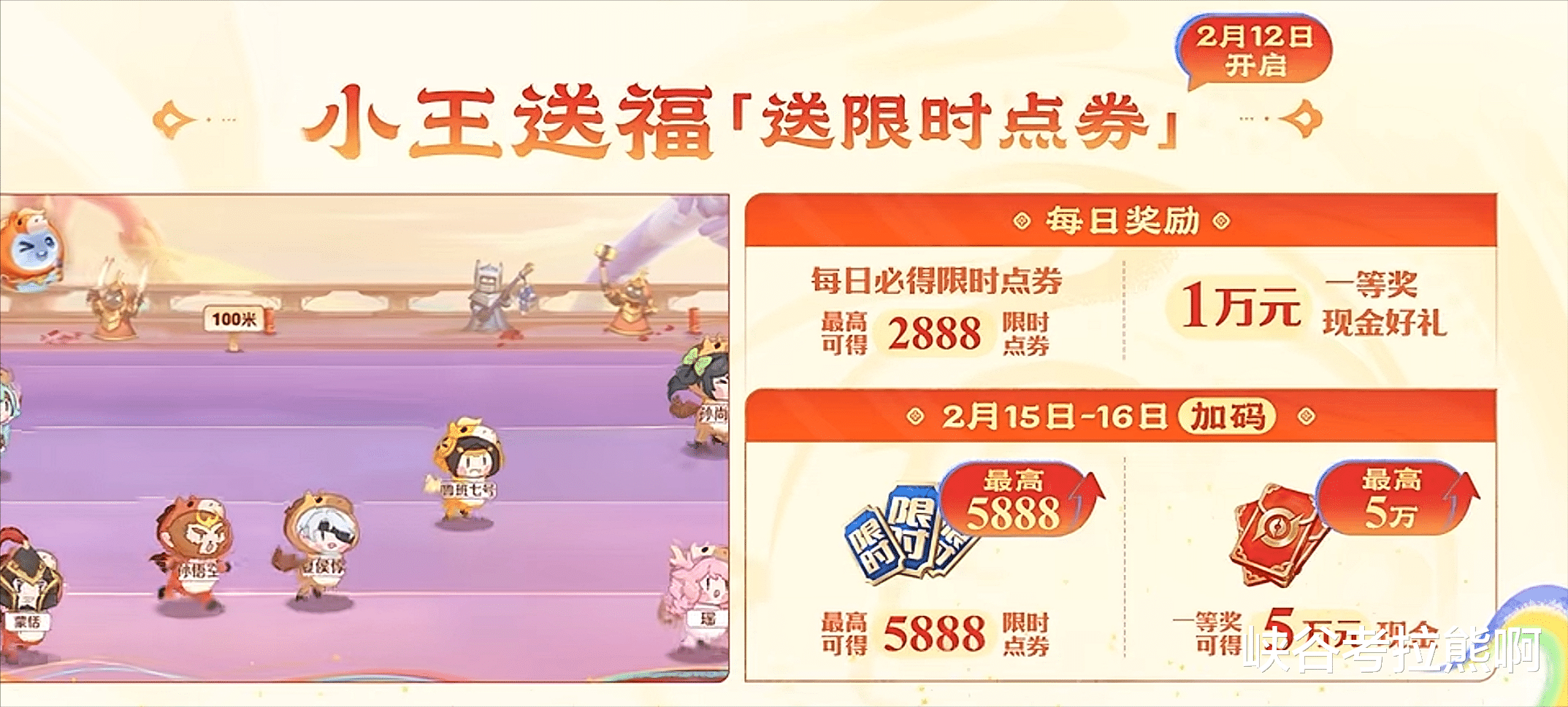 如果运气好拿到暴击奖励,直接翻倍至5888限时点券,2月15~16日,参与活动必得68限时点券,也有机会暴击拿到5888限时点券。