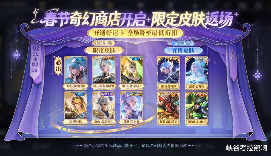 奇幻商店2月15日上线,活动规则不变,还是会在30个折扣商城精细随机抽取,限定皮肤价格为随机的8到9折,直售皮肤和道具、英雄价格为5到7折。而购买好运卡价格直接为最低折扣!