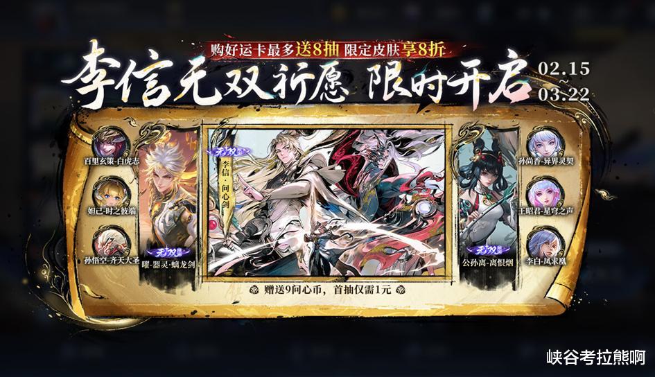 2月15日首先上架的是李信的问心剑,品质无双限定,通过祈愿抽奖入手。局内依旧是三形态建模特效,闪光海报做的真是叹为观止了。