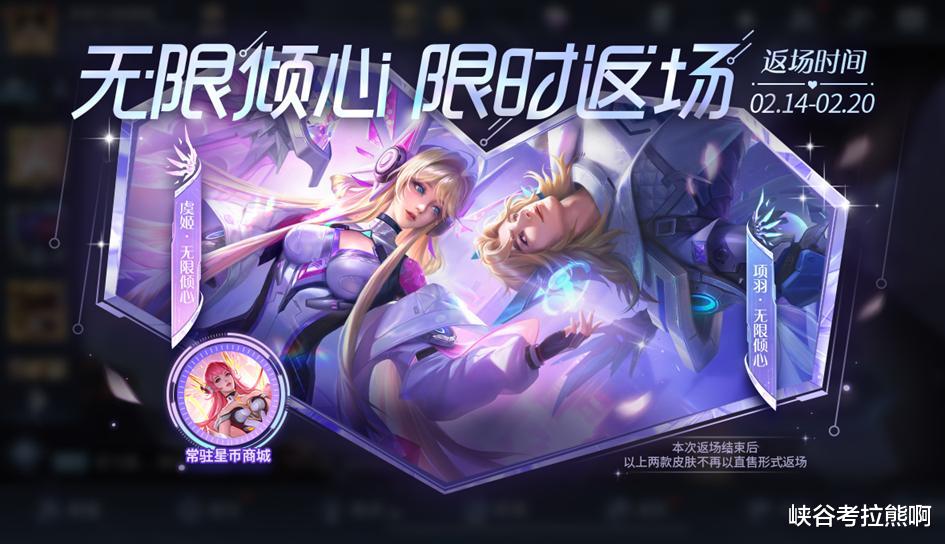 虞姬和项羽的无限倾心系列迎来最后一次直售返场,价格为1788点券,活动期间领取专属优惠券价格为1430点券。而虞姬星传说无限倾慕将常驻星币商城,价格为3000星币。