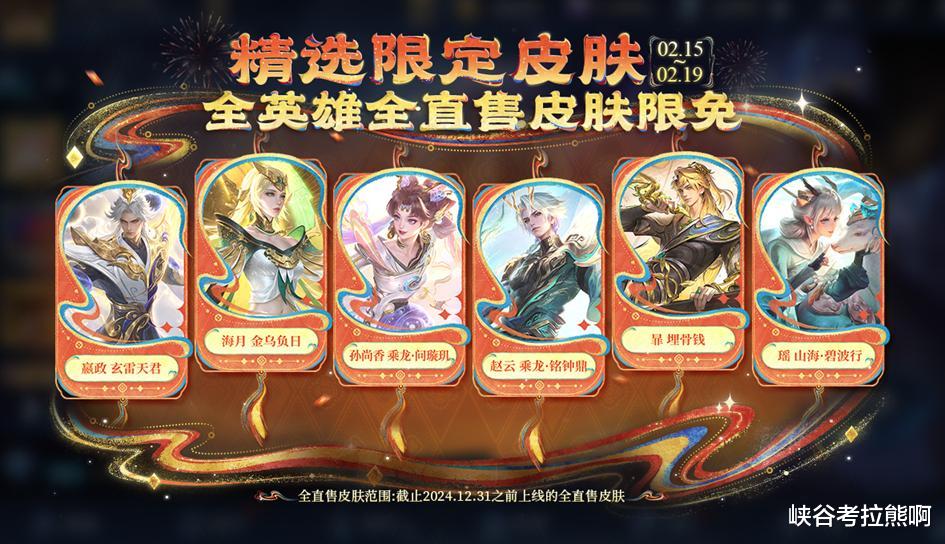 2月15日到19日,全英雄及直售皮肤都可以限时免费畅玩了,另外还精选了玄雷天君、金乌负日、乘龙问璇玑等6款限定皮肤共大家免费试玩,所以这几天一定是排位乱战时期。