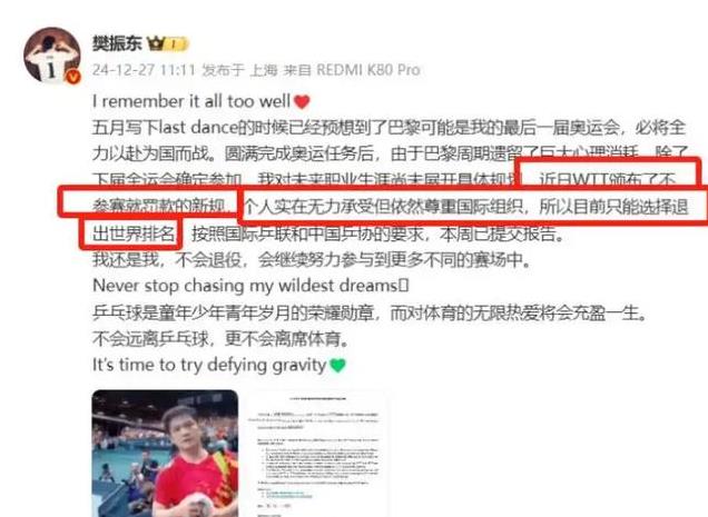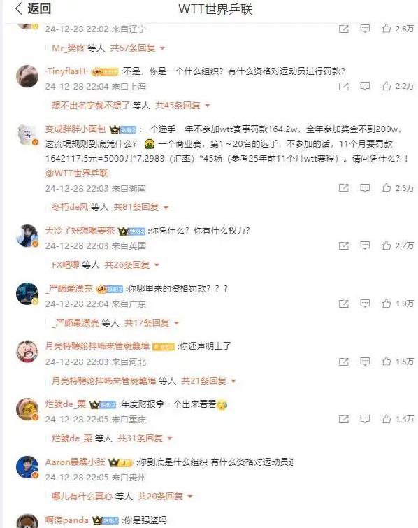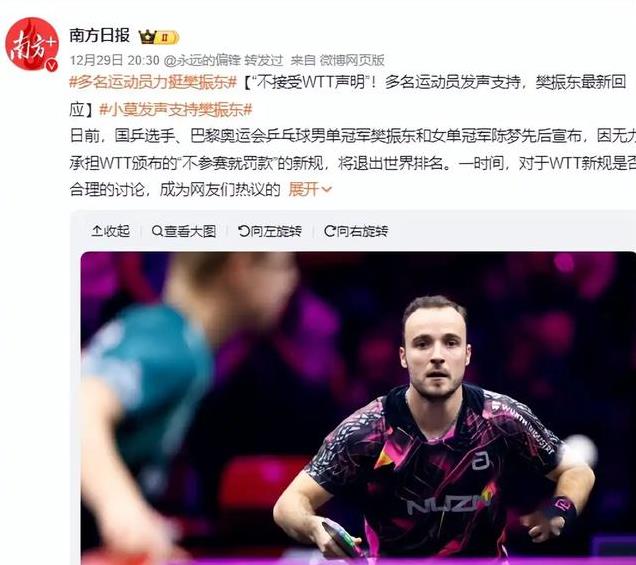 樊振东之所以会做出这样的选择,显然是对WTT的新规感到非常不满。在12月27日发布的新规中,WTT要求运动员在参赛前缴纳高额报名费,并且退赛和参加其他比赛都要交罚款,最高可达5000美元。而且奖金分配上也存在问题,运动员的奖金必须在减去罚款后高于350美元才会支付,而且奖金数额可能会随时被更改。
