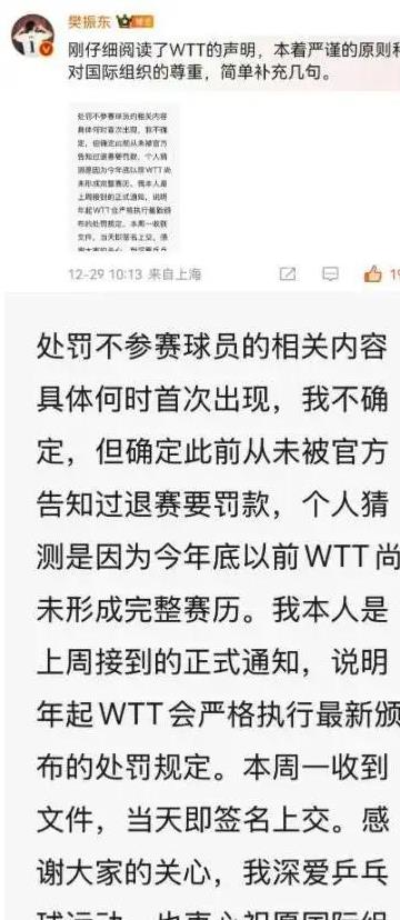 而在樊振东做出退赛决定后两天,WTT发布声明试图澄清新规,并称其为“好规则”。但是樊振东很快对此表示质疑,他认为这个规则之前根本没有被任何人知晓,而且对运动员的参赛生涯影响巨大。很多网友和媒体也对WTT的做法表示愤怒,我们不能因为商业利益而牺牲运动员的基本权益与健康。