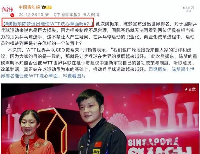 乒乓球世界冠军樊振东因不满世界乒乓球职业大联盟(WTT)于12月27日发布的新规,决定退出WTT及世界排名。樊振东的反抗并非个例,乒乓球女冠军陈梦也表示无法忍受WTT的霸王条款,两人带领众多运动员发声抗议。对于樊振东而言,退出WTT并放弃世界排名是一项重大的决定,这其中必然考虑了多方面的因素,包括自身的职业生涯规划、经济利益以及对乒乓球运动发展的猜想。