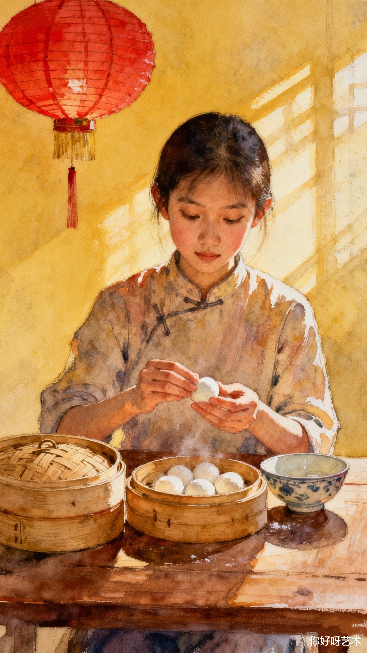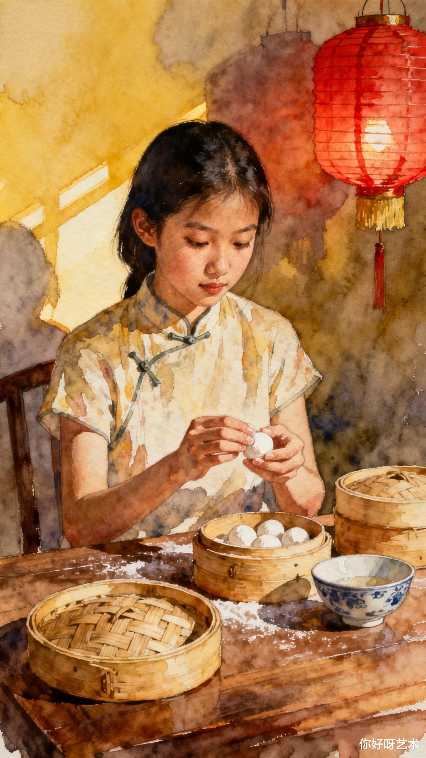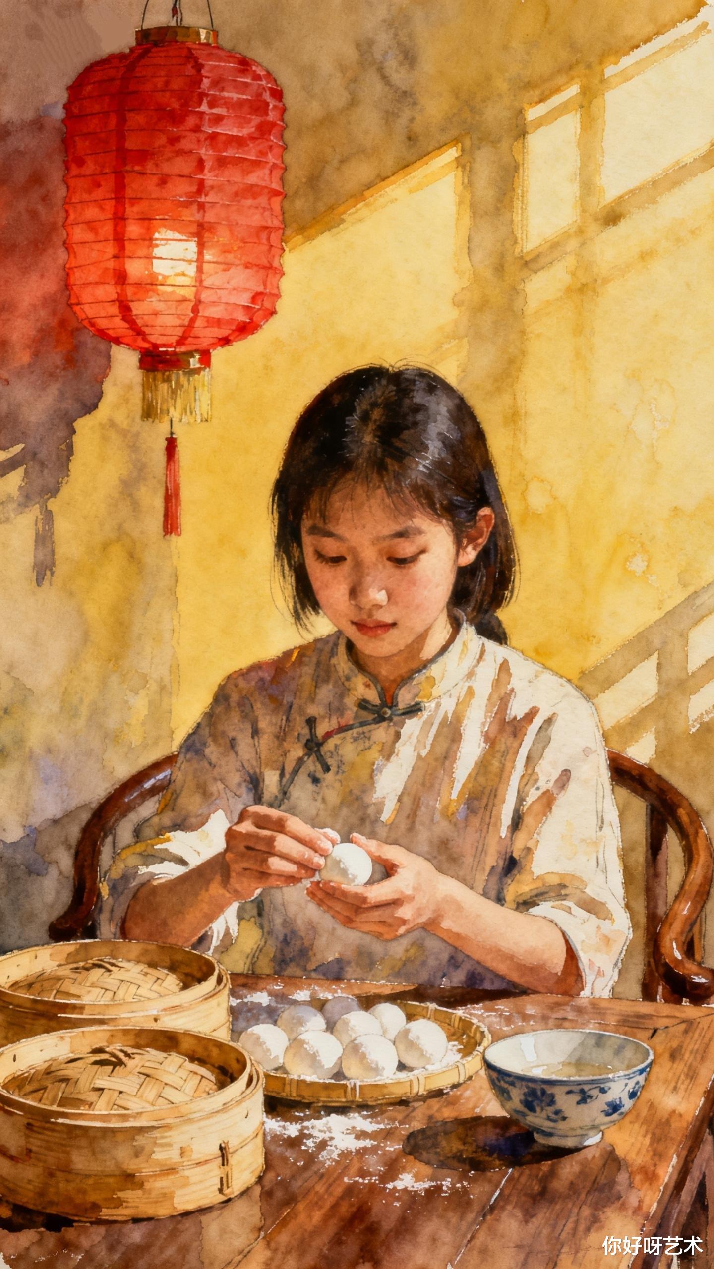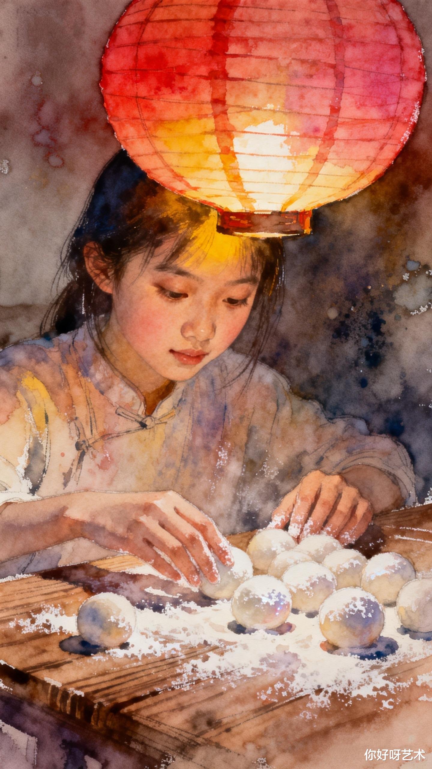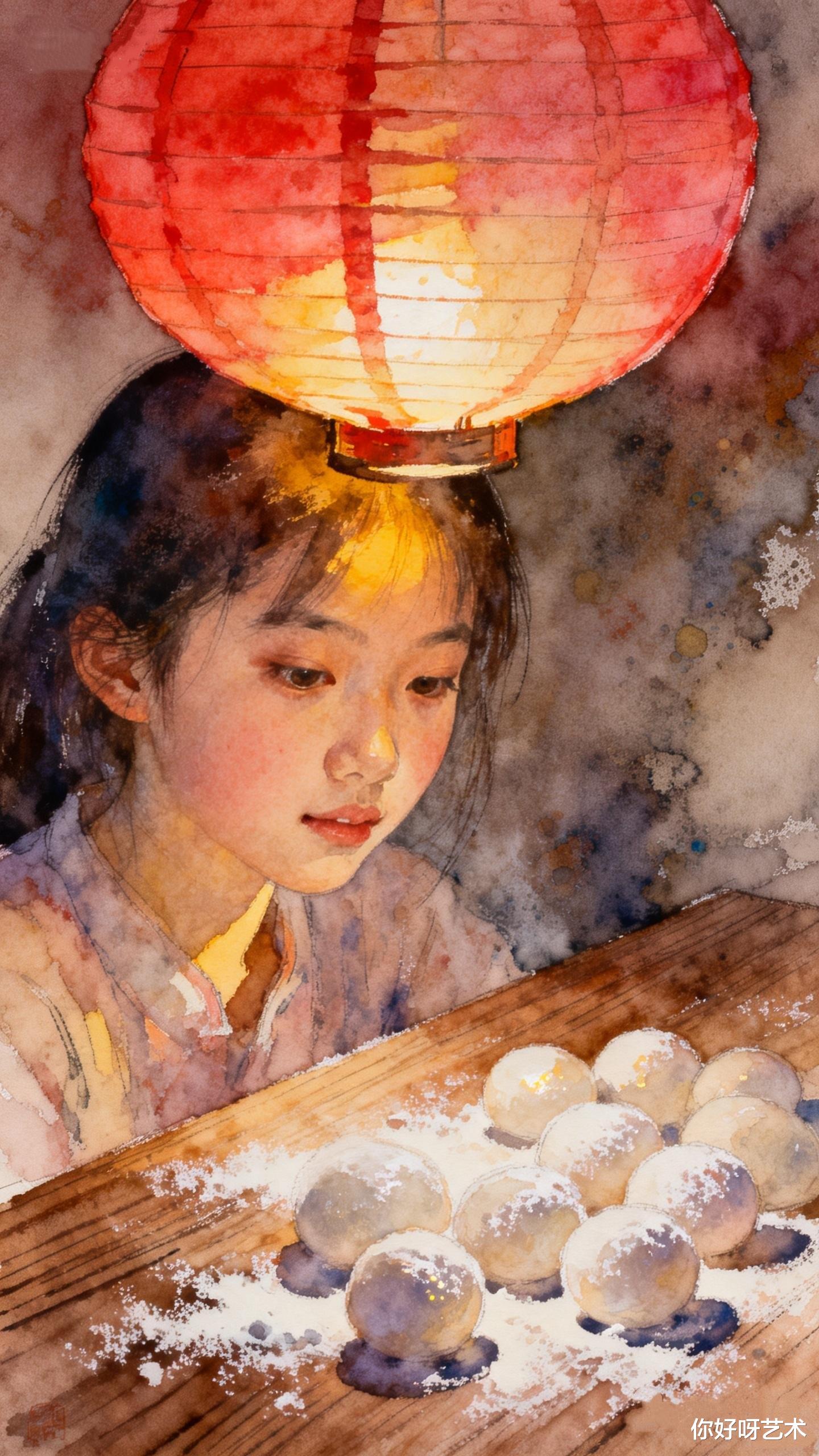 正月十三的晨光刚爬上屋檐,水彩少女便提着竹篮走向厨房。篮里躺着新磨的糯米粉,细白如雪,是昨夜父亲用石磨碾的。磨盘转动时,能听见糯米在石缝里碎裂的轻响,仿佛大地在低语。少女的围裙上还沾着昨夜画灯时的水彩,蓝与红交织,像极了冬日里未融的晚霞。