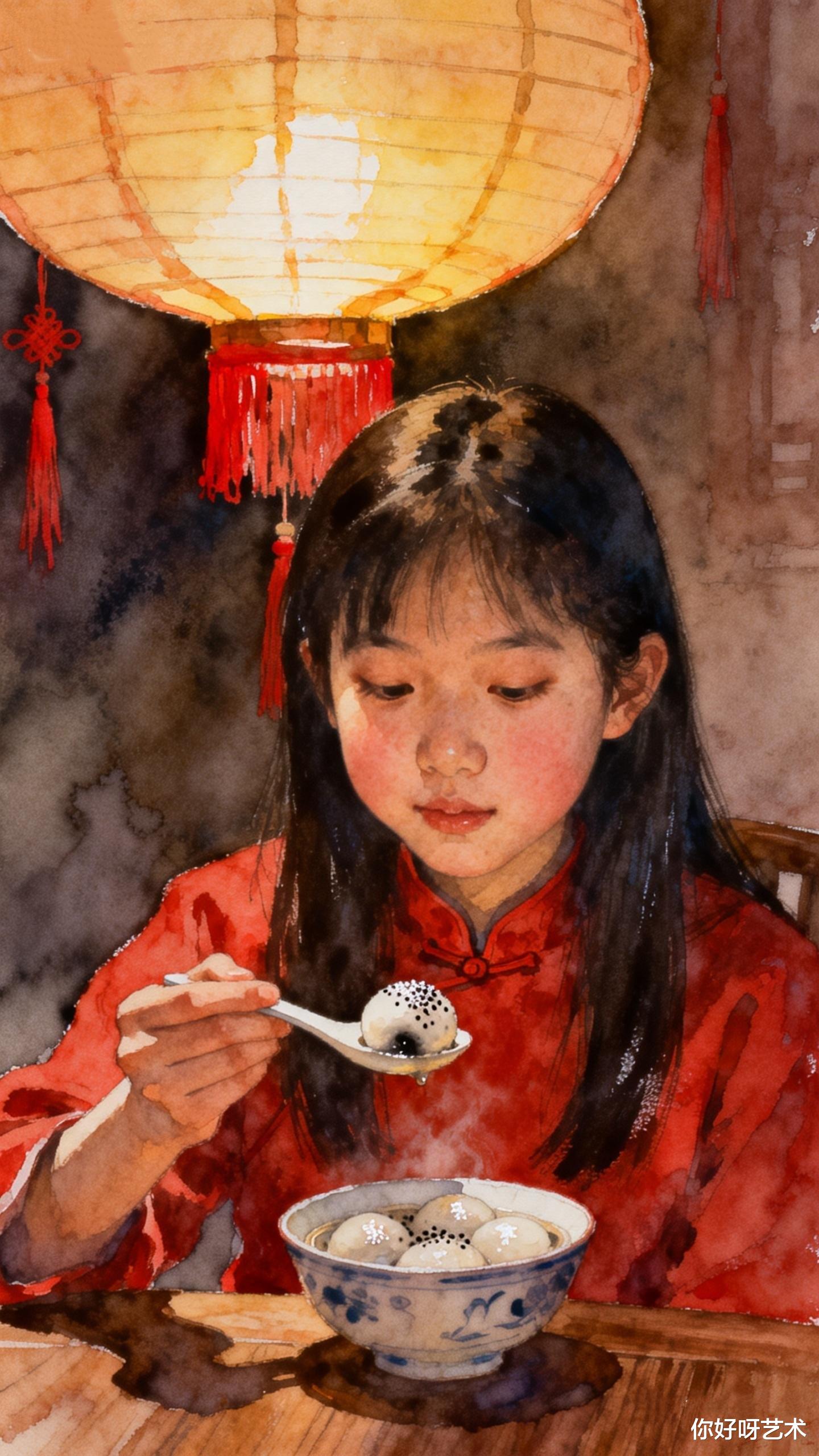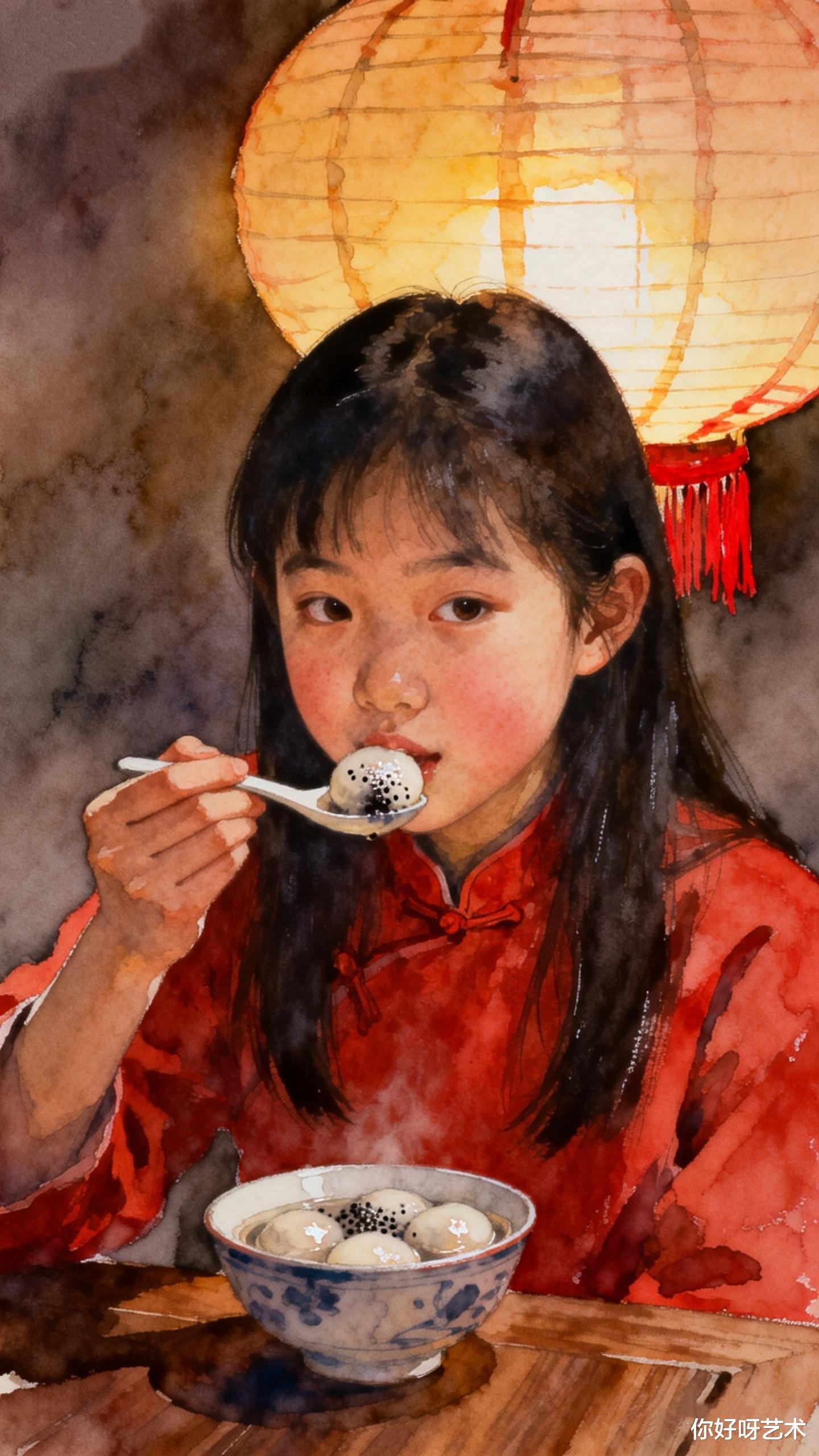 "今日是'点灯日',"父亲指着画中少女,"灶灯亮着,人也要亮。"母亲笑着将最后一碗汤圆推到少女面前,碗里浮着颗红枣,红得像少女发间的绢花。"吃甜的,"母亲说,"甜能记住团圆的香。"少女舀起一勺汤圆,见汤圆在碗里轻轻打转,像极了她此刻的心情。窗外传来风铃轻响,那是父亲挂在檐下的琉璃灯,风一吹,灯影便在墙上跳起圆舞曲。她忽然想起今日在厨房看到的场景:五色糯米粉在案板上排列,像五首等待被吟诵的诗;五福在锅里翻滚,像五颗等待被点亮的星。