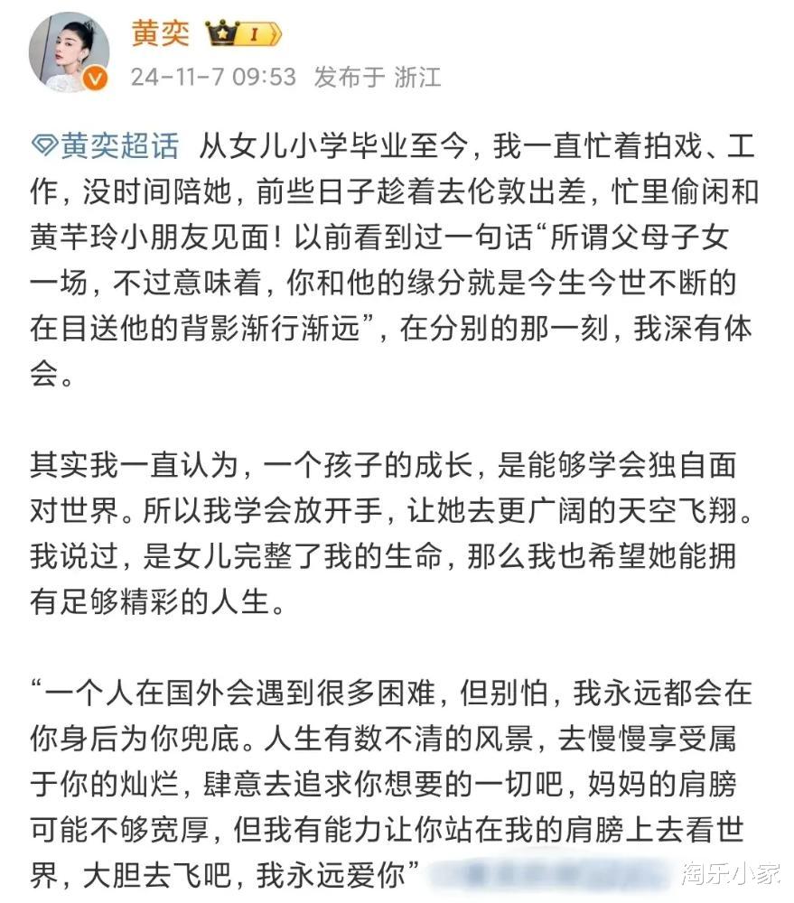 在我看来,黄奕的这个决定虽然意味着母女分离的不舍,但从长远来看,确实是为了孩子能有更好的发展。如今全球化的时代,让孩子尽早接触不同的文化和教育体系,有助于培养他们的国际视野和独立思考能力,这对孩子的未来无疑是一笔宝贵的财富。
