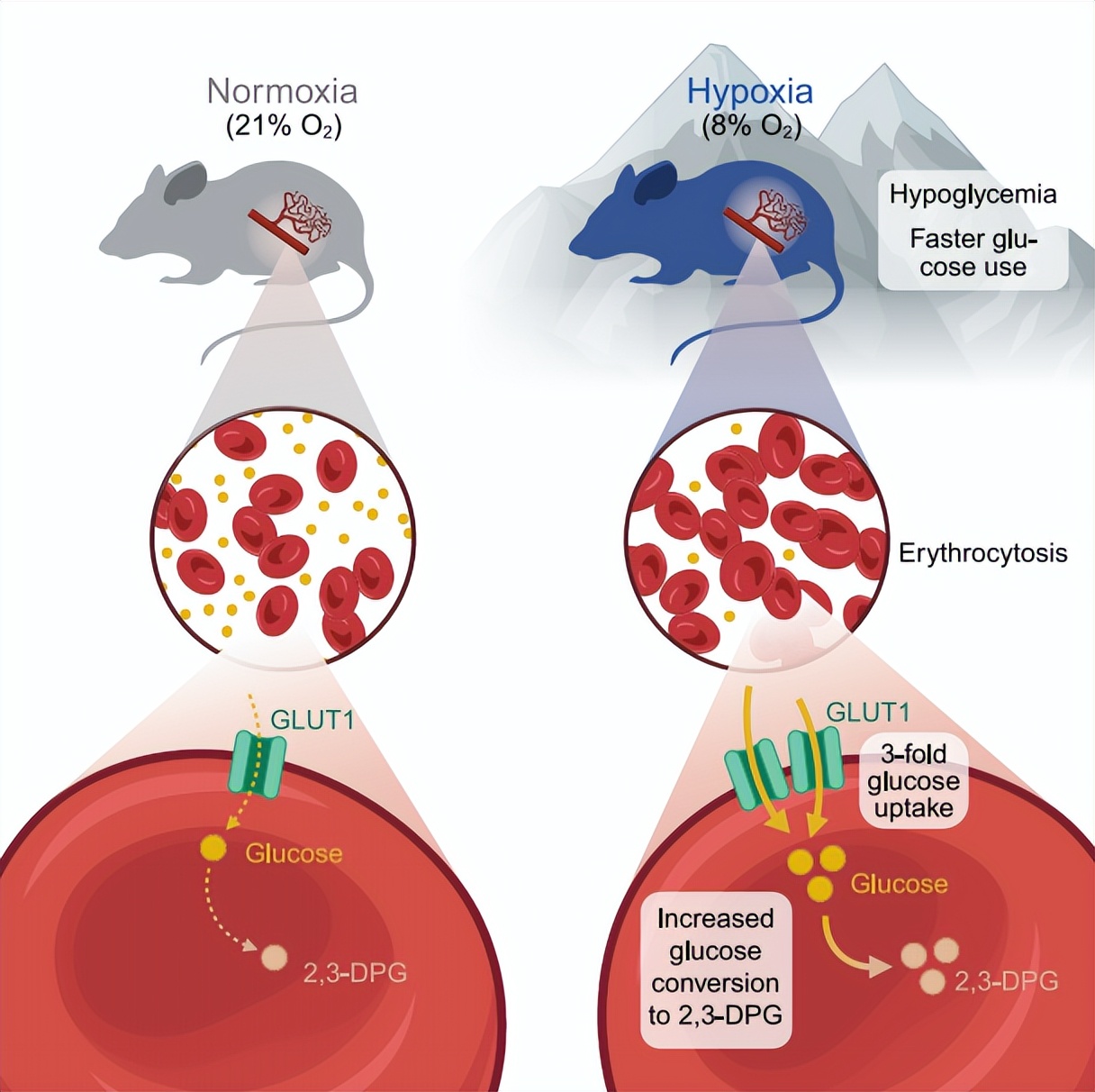 有趣的是,在早期实验中,研究人员注意到,缺氧小鼠的红细胞对葡萄糖的摄取量更高,这背后很可能是葡萄糖转运蛋白的增加。