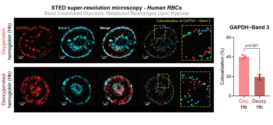 该机制将葡萄糖的消耗与氧气的运输巧妙结合,实现了“一举两得”的生理效应。研究人员利用交联蛋白质组学、STED 显微镜和邻近连接分析,在小鼠和人红细胞中证实了这一机制。