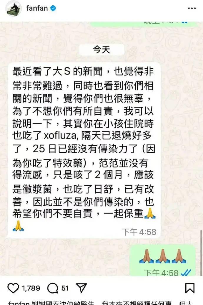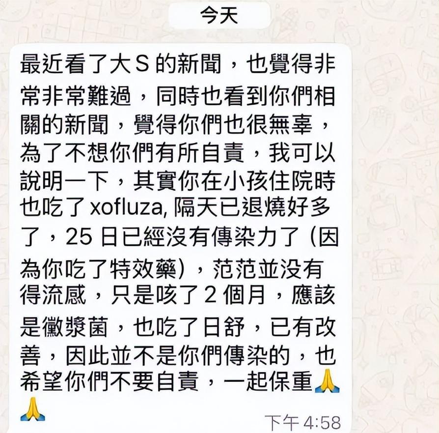 要说这事儿搁谁身上都受不了。本来好闺蜜突然去世就够难过了,现在还要被人扣这样的大帽子。范玮琪憋了二十多天,前几天终于没忍住,在个人账号上甩出一张和台北某名医的对话截图。那医生说得明明白白,范小姐家孩子那会儿是流感住院不假,可当妈的早就吃上特效药了这特效药,服药24小时后基本上就没有传染性了医生还在对话框里特意用红色标了这句话。