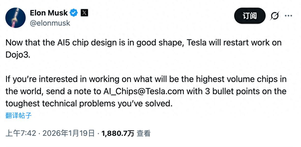 尽管2025年7月马斯克称Dojo 2有望在2026年实现规模化,但随着Grok和xAI的重要性凸显,去年8月,外媒称Dojo团队被解散、负责人离职,马斯克叫停Dojo 2项目。