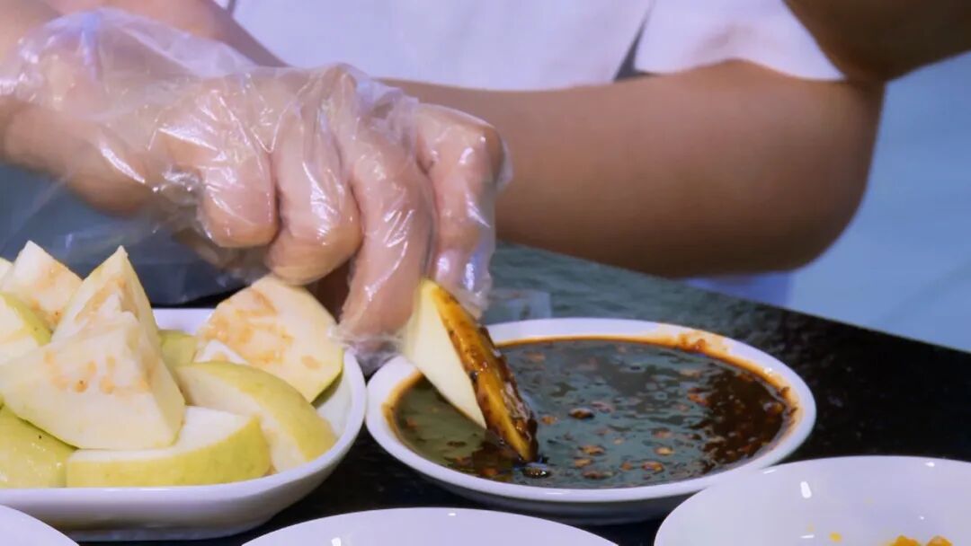 蘸酱的水果大多有着硬脆生酸的特点,生吃时口感算不上绝佳。有与蘸料碰撞时,才会激发出丰富的口感,既开胃又爽口。这种吃法对外地人来说接受度不一,布兰特对水果蘸辣椒盐从惊讶到喜爱的转变过程,生动展现了一个外来者如何逐步理解和接纳海南独特饮食文化的心路历程。