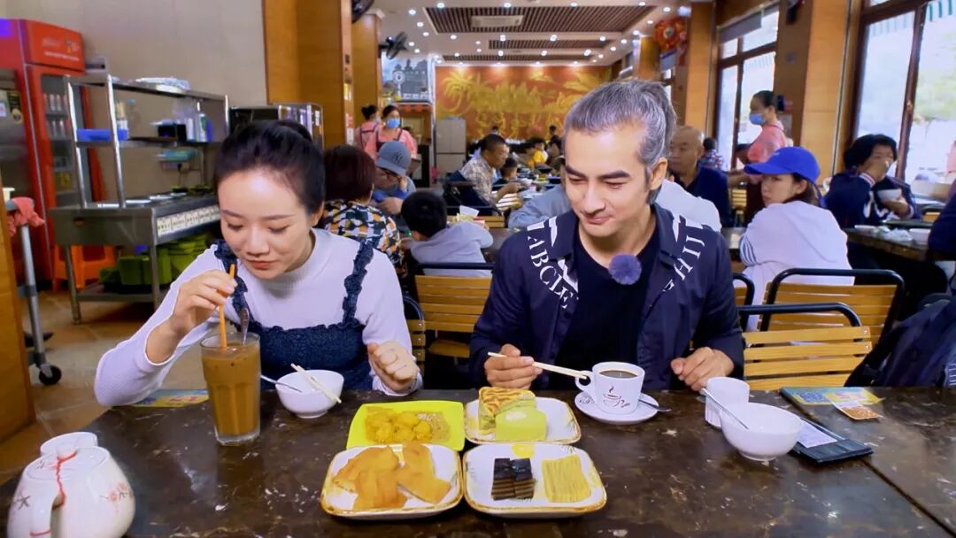 在海口的美食之旅中,两人来到市井气息浓郁的恒兴发茶点店。现烤面包、招牌西多士、炸面饼配炼乳,再点上一大杯可续杯的冰奶茶或柠檬红茶,人均不到二十元,却能享受一个充实甜蜜的下午。奶茶爱好者依依评价冰奶茶奶味特别浓厚,比自己日常喝的奶茶甜味更重一些,却不会腻;在国外经常吃西多士的布兰特,依然被这家店的被西多士征服,现炸面饼外层酥脆鼓起,内里柔软,淋上炼乳后甜而不腻,口感令人难忘。