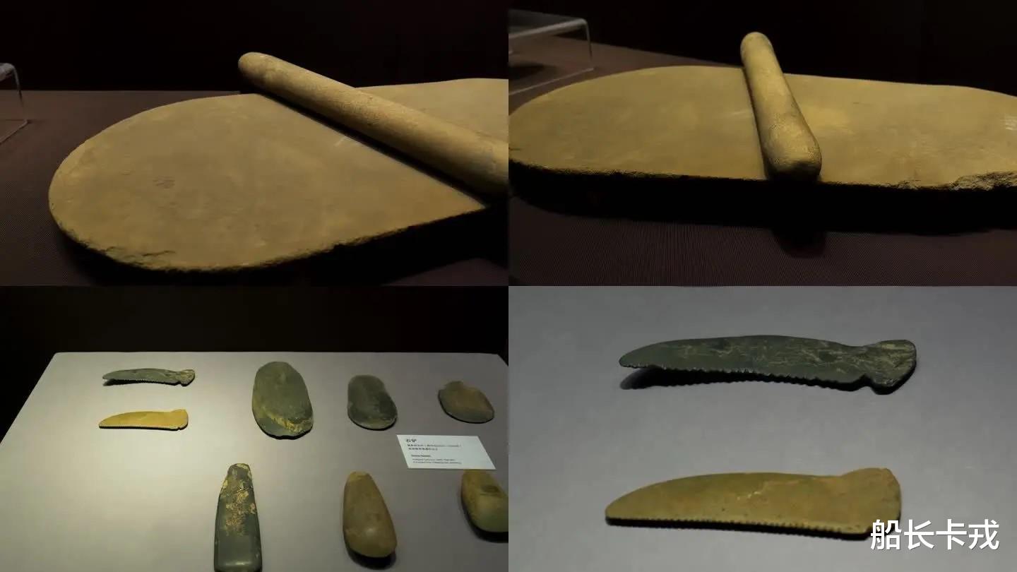 裴李岗遗址很大,面积有5到6万平方米。遗址东边是生活区,西边是墓葬区,合起来是一个完整的聚落。那时候的人用木骨泥墙盖房子。他们用石磨盘加工黍粟,用骨针缝麻衣。遗址挖出猪狗骨头,说明当时已经开始驯养动物。还挖到很多鱼骨、龟甲,可见渔猎也是重要的生存手段。最特别的是石磨盘和石磨棒。这两件东西样子和现在的工具很像,在新石器时代,这就算是先进的粮食加工工具了。
