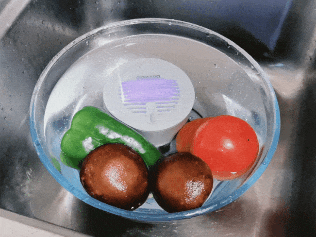 先把果蔬都泡在一个盆里,再把果蔬清洗机打开也放进盆里。等待15分钟,把脏水倒掉后,果蔬就清理好啦——