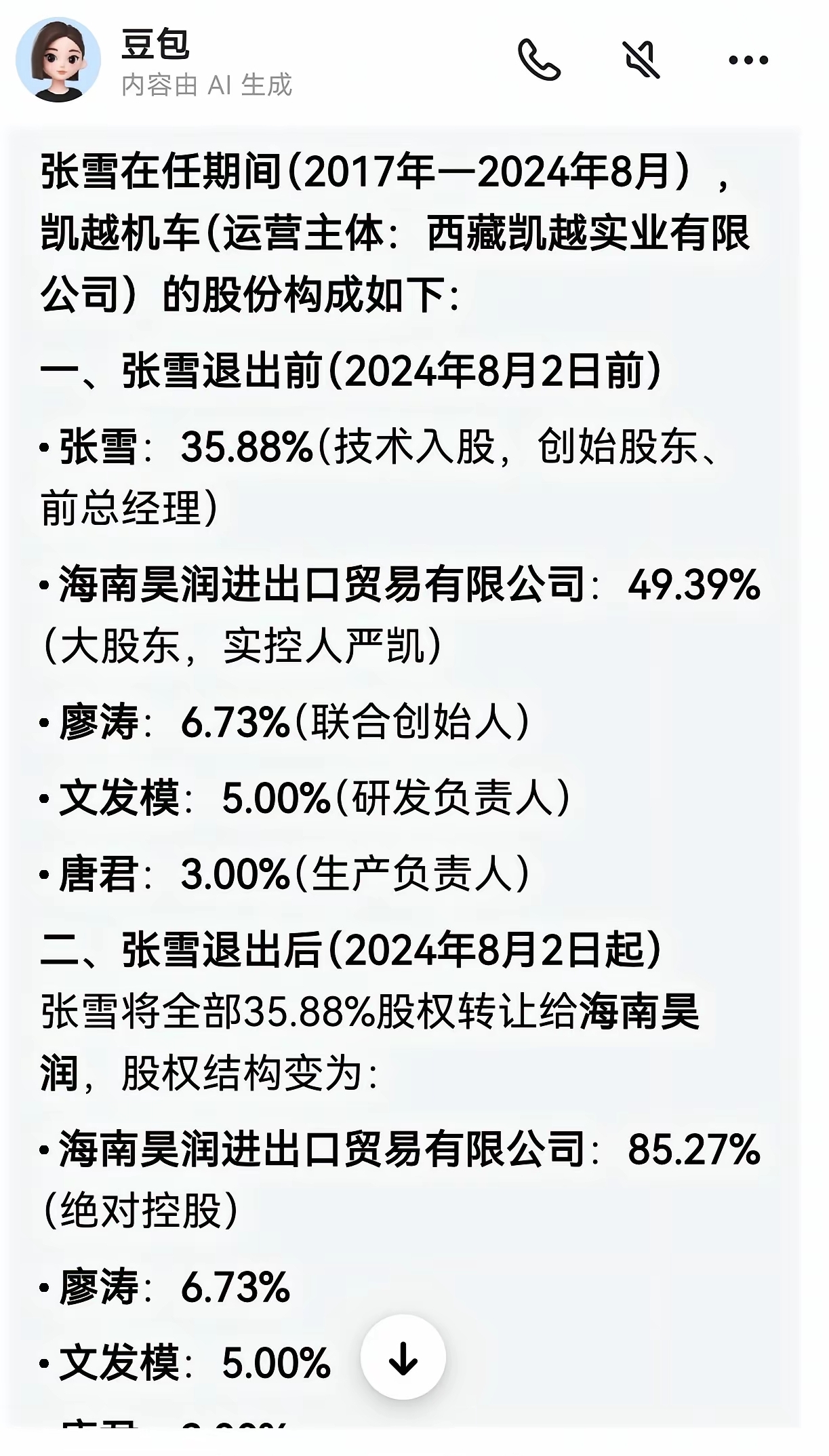 张雪一分没出,按技术入股占股35%,而且他作为凯越的总经理。