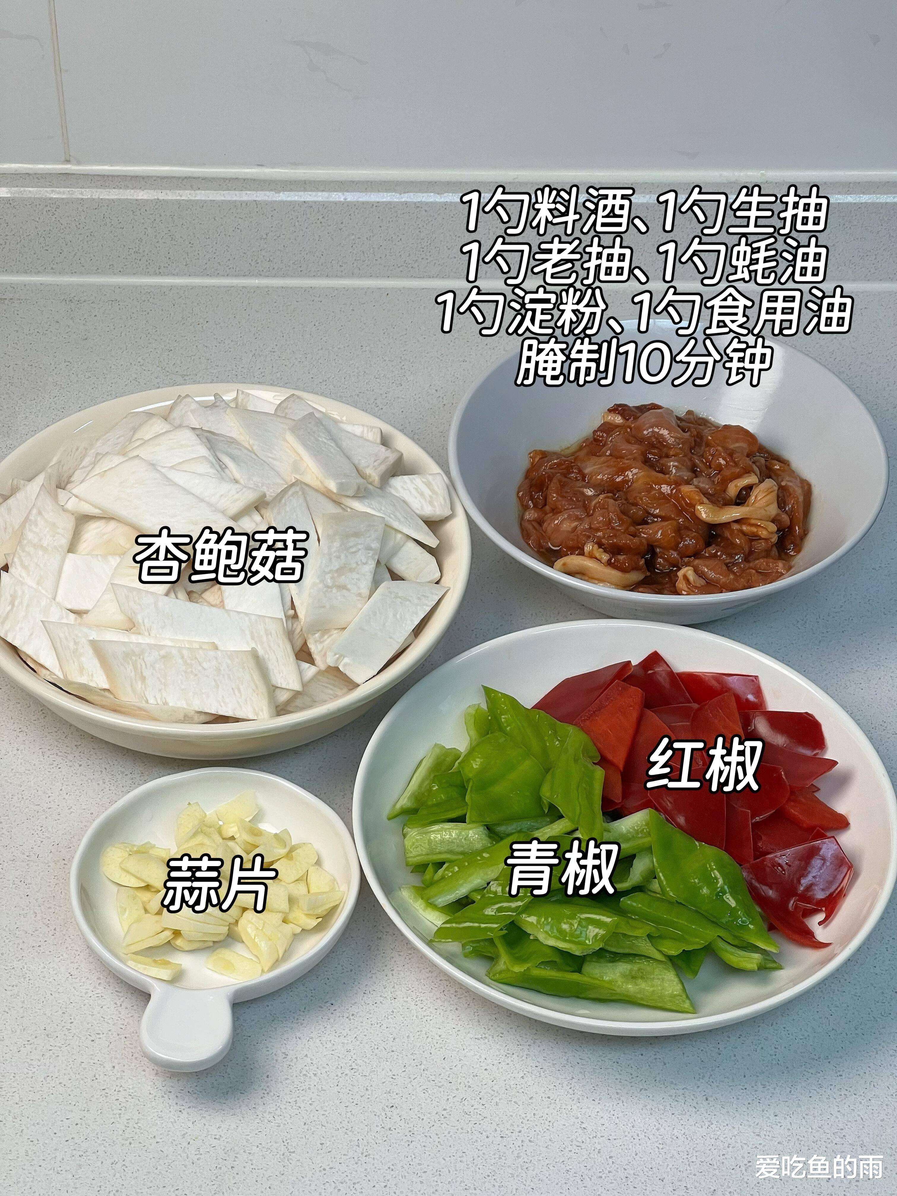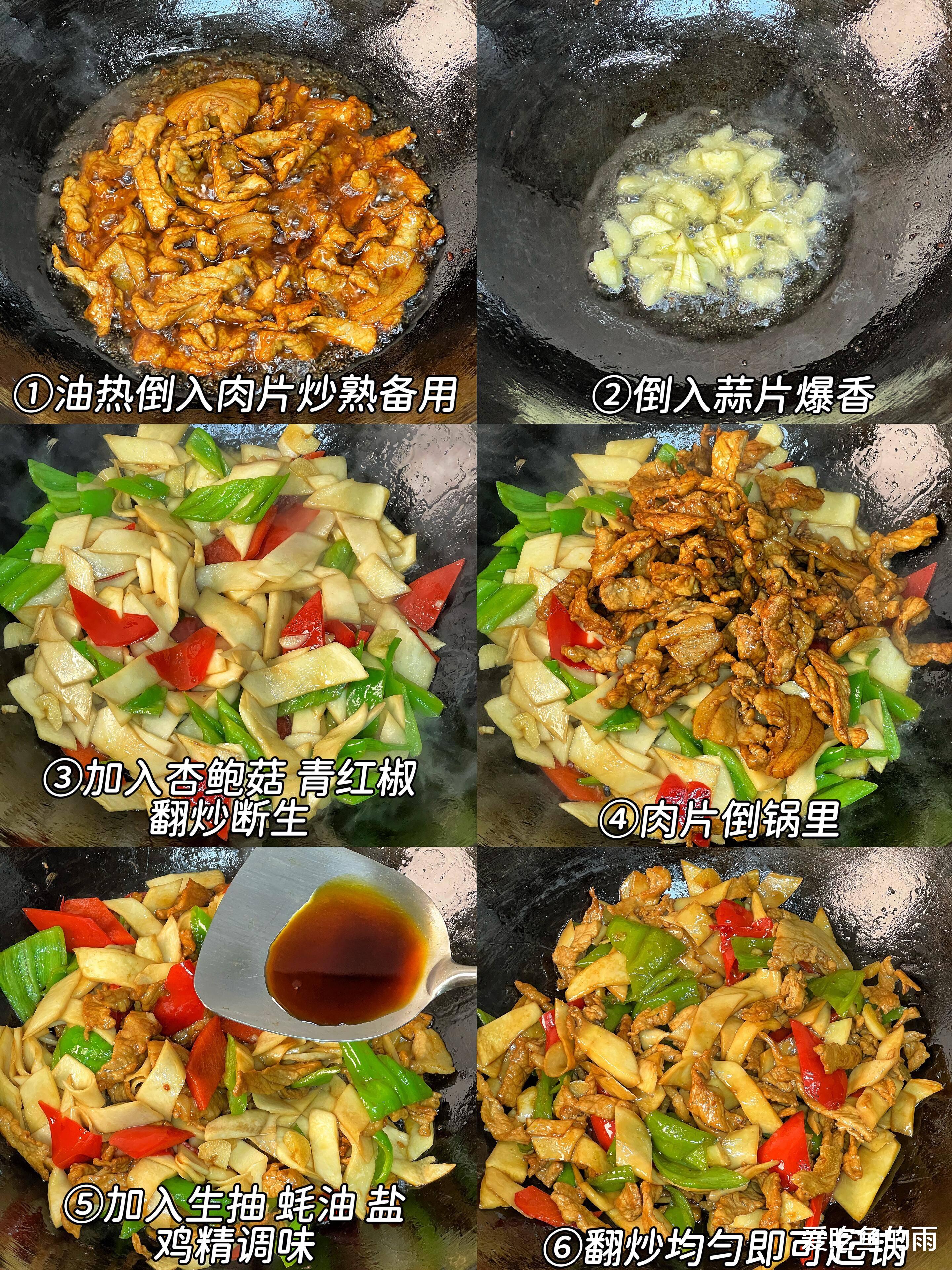 第三招:肉片嫩滑有法宝!猪里脊或梅花肉逆纹切成薄片,腌它!一点生抽、少许料酒、一丢丢白胡椒粉去腥增香。重点来了:加一小勺淀粉和一点点水,抓匀!淀粉水形成的保护膜,是肉片炒不老、滑溜溜的关键!最后淋点食用油封住水分,防止下锅粘连。第四招:碗汁先行,快炒不慌!趁着腌肉煸菇的时间,调个万能碗汁:生抽、一点点老抽(上色好看)、蚝油(提鲜神器)、一小勺糖(综合味道,不明显甜)、一点淀粉、再加两勺清水,搅匀备用。炒菜时火候瞬息万变,提前调好碗汁,保证味道均匀,动作快如闪电!开炒!热锅凉油(油稍多点),油温升高后下腌好的肉片,快速滑炒到变色立刻盛出,别炒老!锅里留底油,爆香蒜末、姜丝(喜欢辣的扔点小米辣圈)。接着请回煸好的杏鲍菇,翻炒几下让它吸点油香。主角肉片回归!倒入灵魂碗汁!大火!让锅气升腾!快速翻炒,让每一根杏鲍菇、每一片肉都裹上亮晶晶、咸鲜浓郁的酱汁。撒一把灵魂葱花!再翻炒个十几秒,香气扑鼻时即可关火装盘!