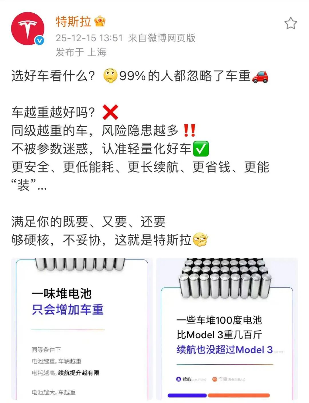 不少车企对此已经早有准备,比如特斯拉在一周前就突然开始就“能耗”大作文章。在特斯拉的官方微博中,该公司多次讽刺了目前一些车企堆电池的做法,而对自身的轻量化技术和续航能力进行卖力宣传。