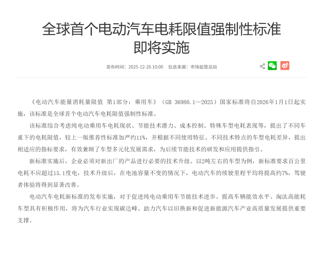 被称为史上最严电动汽车电耗限值强制性标准即将实施,电动车能耗将成为车企考核硬指标。12 月 26 日,根据市场监管总局网站信息,《电动汽车能量消耗量限制第 1 部分:乘用车》将于2026 年 1 月 1 日起实施。