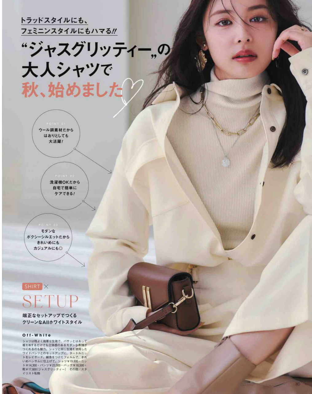 给白色高领衫搭配白色衬衫,可以将衬衫扣子解开几颗,配一条白色阔腿裤,穿一双浅咖色短靴,与深棕色小包包呼应起来。