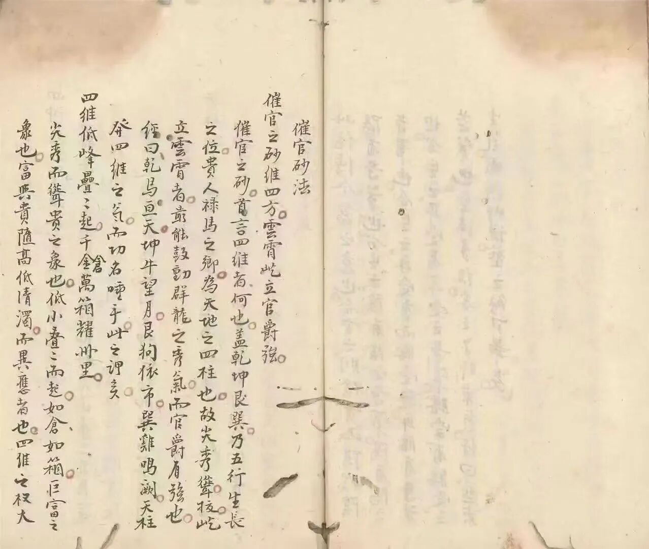 全书构建了逻辑严密、理法兼备的催官理论体系,完整诠释“龙为根本、穴为核心、砂水为辅助”的学术内核。评龙篇详解阳龙辨识、行度生旺、入首真伪等五大维度,将抽象龙气转化为可观测的形法标准;催官穴法篇重点拆解亥、艮、辛、巽、震等吉穴,剖析穴位与天星、二十四山的阴阳感应,阐明“穴为气之聚”的核心要义;砂水篇则系统论述官星砂、催官水的形态与方位,确立“砂主贵、水主富”的辩证实操准则。