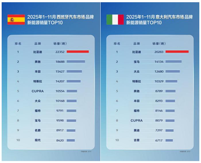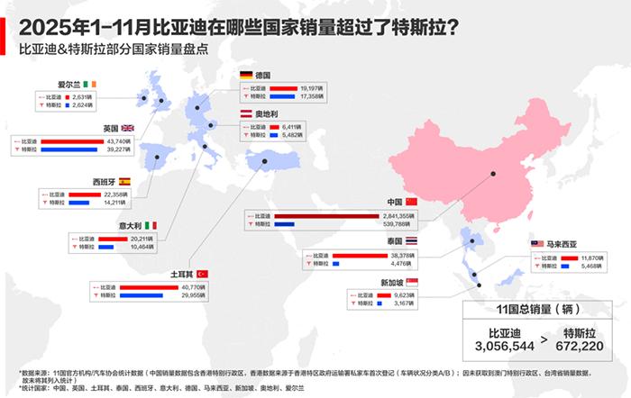 11月,比亚迪在巴西、土耳其、意大利、西班牙、匈牙利、克罗地亚等国拿下了新能源汽车销量第一,在新加坡等国家获得全品牌销冠。