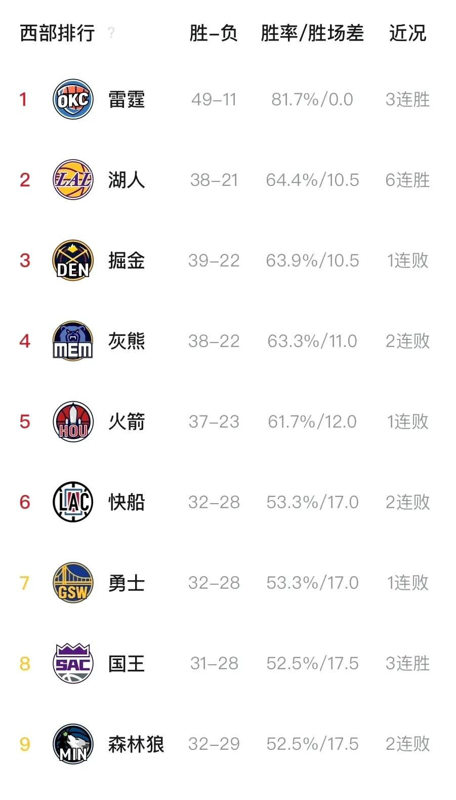 随着今日比赛结束,西部排名发生较大变化!湖人升至第6,6-10名这5支球队之间最高只相差0.5个胜场,争6太疯狂了!具体排名如下: