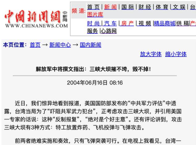 2020-06-29 北晚新视觉网综合 《"不要闹了,台湾雄风导弹只配给三峡大坝拍灰尘"岛内媒体人难得清醒》2018-01-16 环球时报 《反人类、脑残、白痴闭上臭嘴——“导弹炸三峡大坝”在台湾被骂惨了》2004-06月16 中国新闻网 《解放军中将撰文指出:三峡大坝摧不垮,毁不掉!》2023-06-14 光明日报 《守护好三峡这片绿水青山》