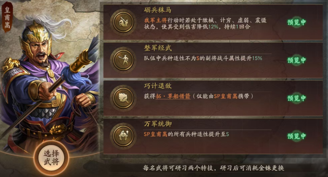 1、砺兵秣马:我军主将行动时若处于缴械、计穷、虚弱、震慑状态,使其受到伤害降低12%,持续1回合。SP皇甫嵩这个特性是最好的了,不是因为它强,而是因为其它三个实在是一般般。你会发现,策划在治军武将的设计上,强武将增加得比较少,弱武将增加得多,这样强弱武将就可以拉齐到比较接近的水平。例如霸王讨逆剧本的司马懿和SP郭嘉,只是象征性的增一些,远不如赵云陆逊增加得多。SP皇甫嵩也是这个道理,否则整个生态就失去平衡了。