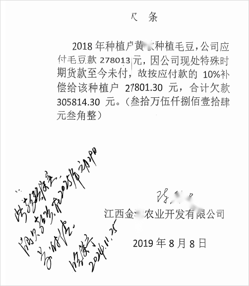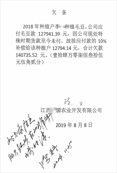 “2018年我们和某源公司签了合同,他们提供种子和技术,我们负责种,说好收购后9月付一半款,年底结清。”种植户代表黄女士指着泛黄的合同复印件回忆,合同中明确约定有机毛豆一级品收购价3.3元/公斤,仅他一人的采收记录就显示应结算28.5万元,自2018年到期未付后,按银行同期贷款利率估算,历经7年,本息合计实际欠款为30.58万元。类似的欠条涉及20余户种植户,按照单亩产量700公斤、2000多亩土地计算,累计产量达1000多吨,按合同价3.3元/公斤计算,累计债权超300万元。这些由企业盖章的欠条,如今成了种植户手中难以兑现的“白条”。