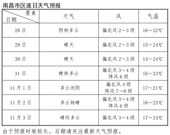 预计,本周我市为多云到晴天气。28 日阴转多云;29-30 日晴天;30 日-11 月 1 日受高空槽和热带系统外围影响,多云间阴,偏北风力加大至 4 级,江湖水面、平原河谷和高海拔山区阵风可达 7~8 级;2 日多云转晴;3 日晴间多云。