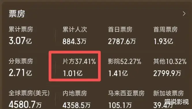 而这么高的成本,若是按照猫眼平台的分账比例估算,即便影片最终得四千六百万票房,片方实际所得也仅约一千五百万。