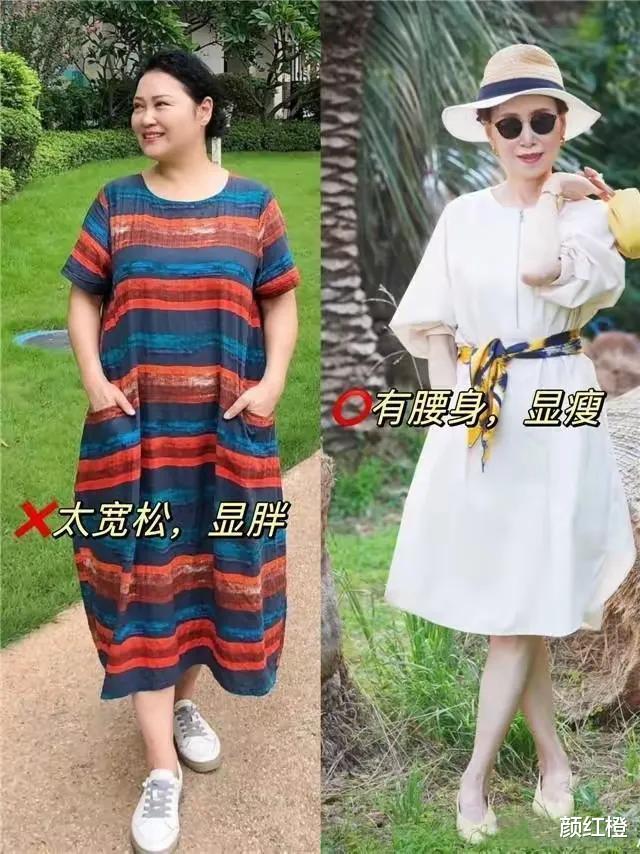 或者是你的衣服是那种渐变色的,花色鲜艳的款式,下面这两件衣服就很容易暴露年龄,就算衣服的质感再好,也无法穿出高级感,这两身穿衣打扮确实达到遮肉显瘦的效果,但是失败就失败,在色彩搭配上。