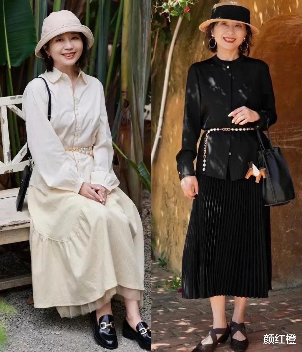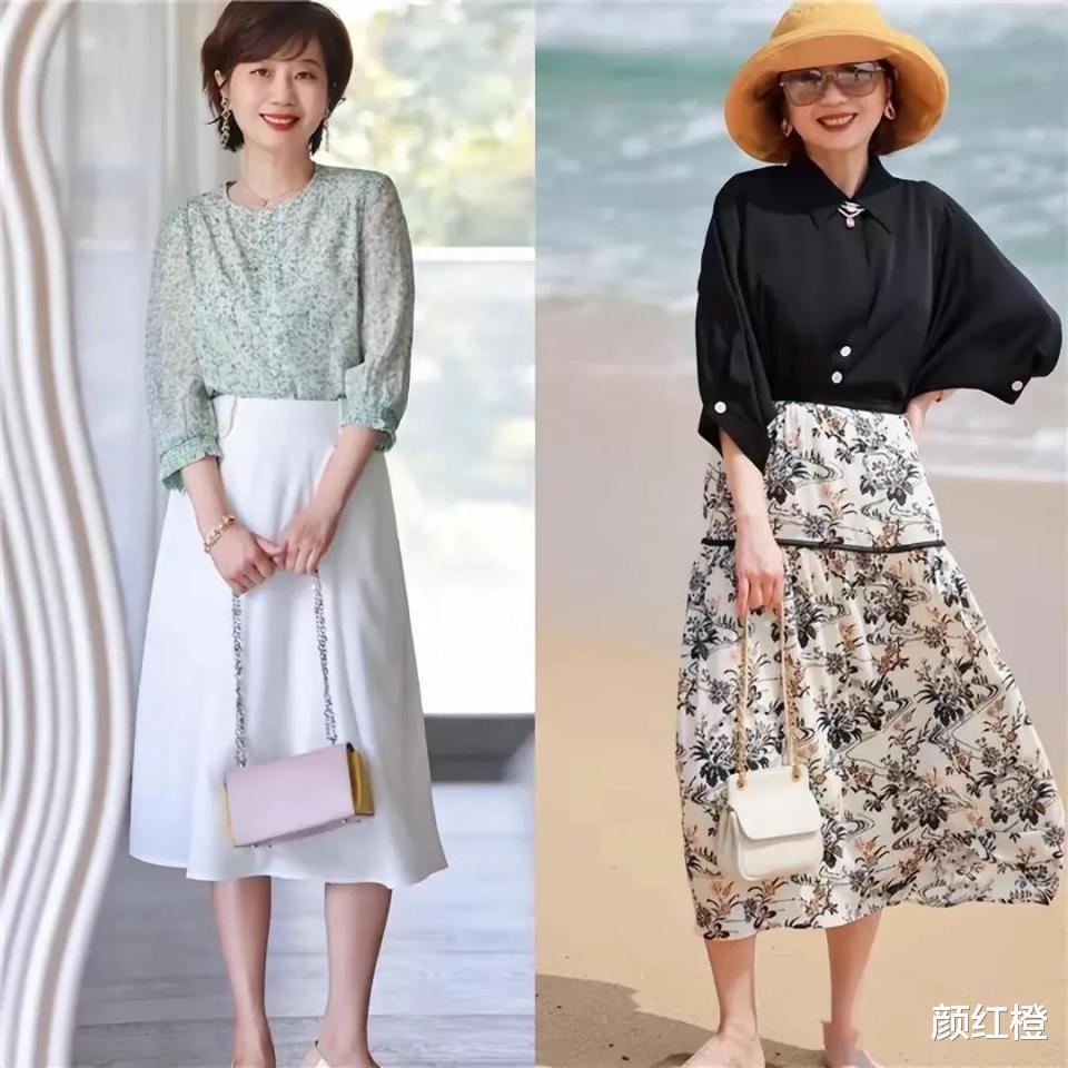 要穿出显气质,显档次的造型,播放可以选择像下面这两套穿搭样用印花的衬衫搭配上白色的半身裙或者是黑色的衬衫搭配上印花的散装半身裙,这样的穿衣打扮,才能把中年女性岁月刻在骨子里面的优雅和气质散发出来。
